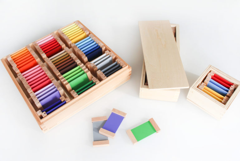 Pudełko nr 1 jest najłatwiejsze, znajdują się w nim 3 pary kolorów podstawowych (żółty, czerwony, niebieski) . W pudełku nr 2 mamy 11 par tabliczek w różnych kolorach. Natomiast pudełko nr 3 i 4 zawierają kolorowe tabliczki w różnych odcieniach.